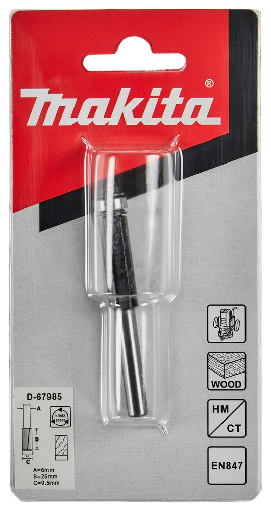 Hardmetalen sponningfrees. Geschikt voor het afschuinen en frezen van geplastificeerde of gefineerde plaatmaterialen. De kogellager geleidt de frees perfect langs het werkstuk. Makita kantenfrees 9,5mm met kogellager, voor hout. Deze frees heeft 2 beitels en past in een 6mm spantang.