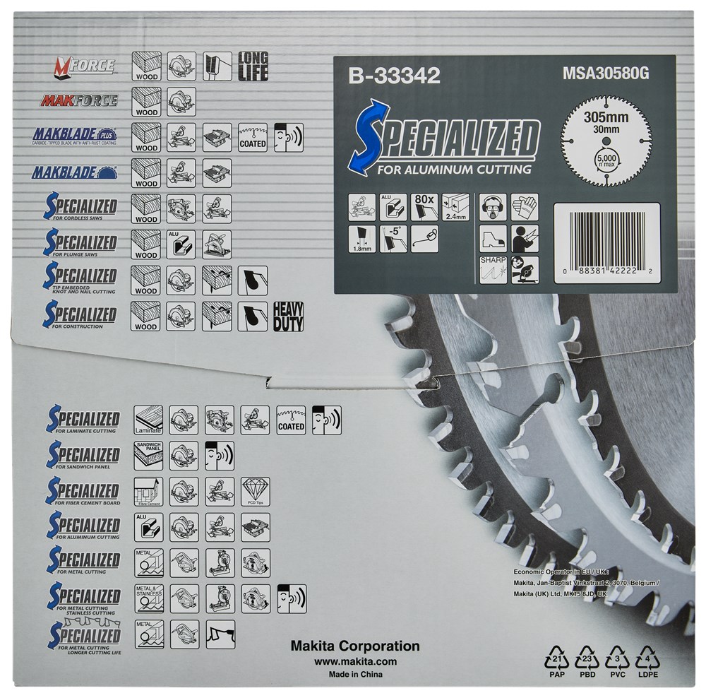 Makita heeft een uitgebreid assortiment cirkelzaagbladen voor de diverse machines. Kies een zaagblad voor het te zagen materiaal en passend op de te gebruiken machine; er zijn verschillende kwaliteiten, waarbij de Makita Efficut zaagbladen tot het top segment behoren. Voor meer informatie omtrent cirkelzaagbladen zie het Makita kenniscentrum: https://www.makita.nl/kenniscentrum/cirkelzaagbladen-en-de-technieken-erachter.html Cirkelzaagblad met negatieve TCG-vertanding bij uitstek geschikt voor het afkorten van aluminium, koper, messing, brons en andere non-ferro metalen. Tevens geschikt voor HPL en kunststoffen. Het blad is nauwkeurig gespannen voor een vlakker blad en zuivere sneden.