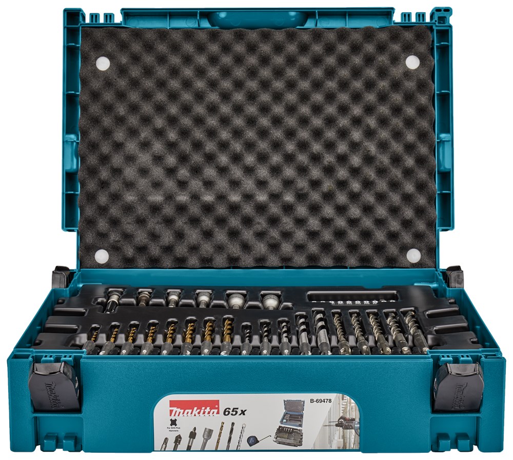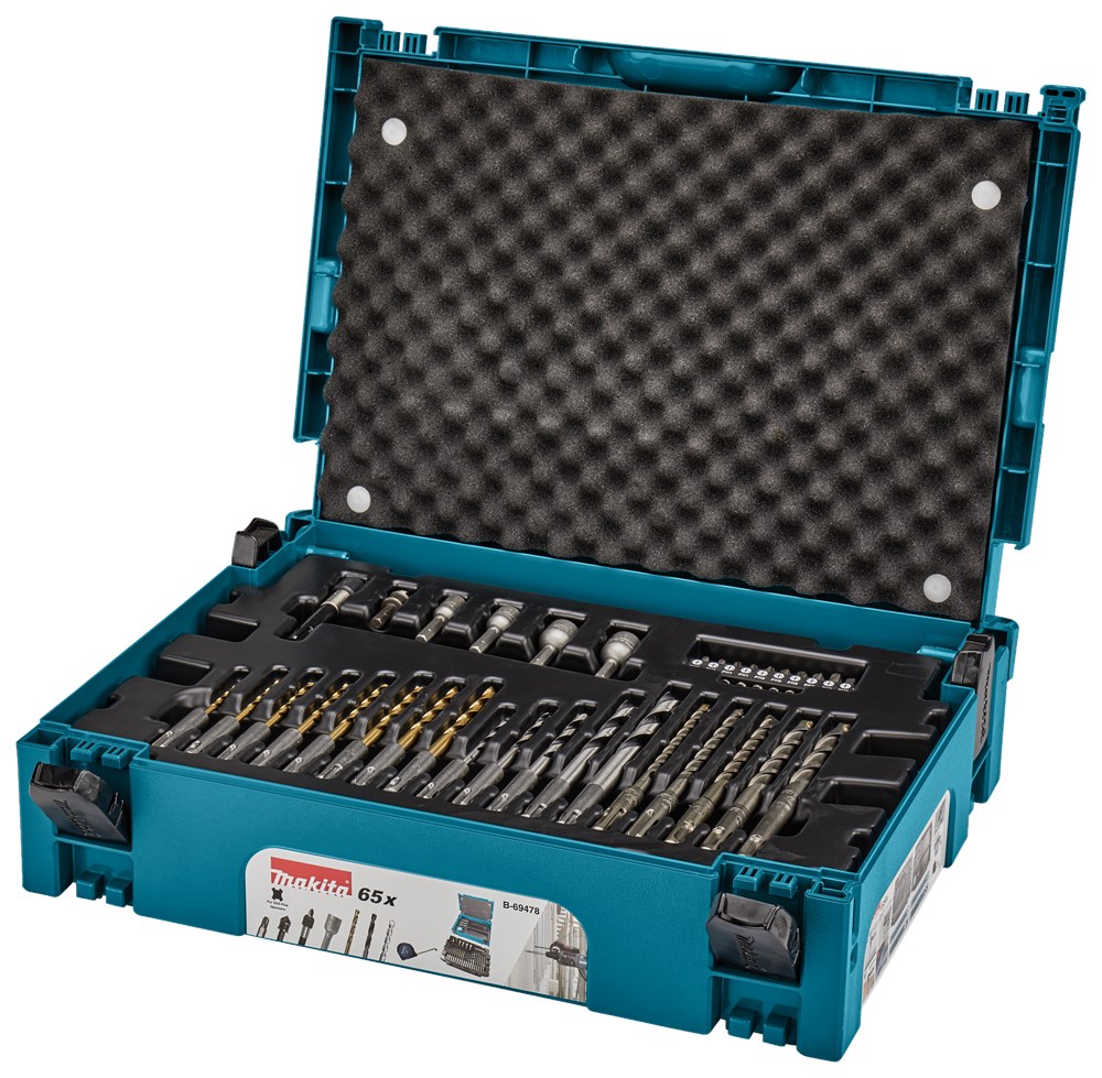 65-delige Makita boor-/schroefbitset in Mbox1 bestaande uit een 40-delige schroefbitset 25mm, 21-delig borenset assortiment, rolbandmaat 3 meter, verzinkboor, 5-delige doppenset 8-13mm en een magnetische bithouder.