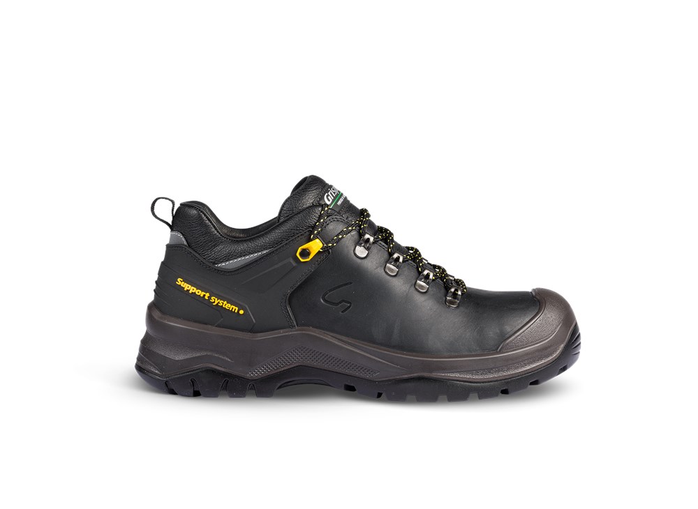 Deze Grisport veiligheidsschoen van zwart leer, de 70216L met veiligheidsklasse S3, heeft een geperforeerde stalen veiligheidsneus en een stalen tussenzool. Dankzij de PU/Rubber zool met antislipprofiel is deze schoen bestand tegen temperaturen tot 200 °C, en zelfs kortstondig contact met temperaturen tot 300 °C. Het Heel Support System geeft extra steun en bescherming aan de drager. Dit lage model veiligheidsschoen heeft een slijtvaste overneus, meerdere 3M reflectiestrips en een grof profiel. De voering is van leer waardoor de schoen ademend is.